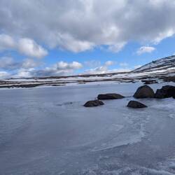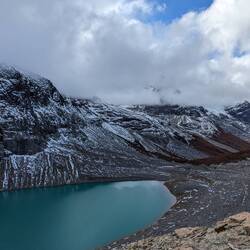 Vic a ses bâtons, moi j'en trouve 2 et honnêtement avec le vent qui nous attendait sur le chemin, 4 appuis c'étaient pas de trop. Le vent souffle tellement sur les lacs aux alentours qu'il y a des grosses vagues et des tourbillons de brume dessus ce qui crée de très beaux arcs-en-ciel. C'est impressionnant ! Mère nature nous en fait baver, elle nous fait vaciller de gauche à droite et d'avant en arrière (cf Victor avec ses 2 bâtons qui essaient de tenir sa position avec beaucoup de difficultés). On avait jamais senti autant de vent c'est fascinant !