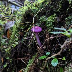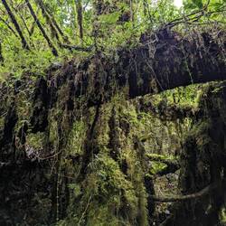 Bref on commence enfin cette rando sous un ciel bien nuageux, les chances pour voir le glacier sont minces mais on le tente quand même. La randonnée est magnifique, une jungle humide recouverte de mousse et de champignons dont certains d'un violet incroyable. On prend notre temps car elle ne dure que 2h et Victor essaie de trouver des escargots violets qui font parti du bestiaire du parc. Pas d'escargots à l'horizon malheureusement. Et d'ailleurs, pas de Ventisquero Colgante.. Les nuages cachent entièrement le glacier et l'on ne peut seulement apercevoir la cascade qui en découle. Tant pis on s'y attendait, la rando était quand même très sympa. On rentre tranquillement en stop au camping après deux bonnes heures d'attentes avec un chien qui nous tient compagnie.
