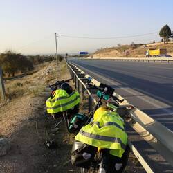 Plötzlich war die Nebenstraße zuende. Zurück war keine Option der Umweg wäre zu weit. Also schieben und tragen wir alles den berg hinauf und über die Leitplanke auf die Straße.