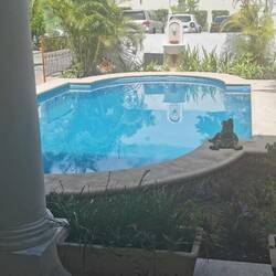 15:01Uhr und wir sind im Hotel. Wir packen gar nicht aus, sondern suchen nur unsere Badesachen und springen in den Pool. Wieder fehlen mir die Worte. Ein kleiner Pool im Innenhof. Rundum liebevoll bepflanzt und geschmückt mit kleinen bunt bemalten Keramiktierchen. Flamingos, Schildkröten, Frösche. Schön. Der Pool macht Spaß, aber eine Erfrischung ist er nicht. Denn er ist nicht überdacht und daher biesl warm. Plötzlich regnet es. Erster Gedanke: Schnell raus aus dem Pool. Zweiter Gedanke: Warum eigentlich? Nass sind wir eh schon und warm ist der Regen noch dazu. Also bleiben wir im Pool. Ein paar Donner bringen uns auch noch nicht aus der Ruhe. Aber beim zweiten Blitz, suchen wir dann das Weite, bzw. unser Zimmer. Wir haben Klima, Warmwasser, eigenes Wlan im Zimmer und einen TV mit Netflix. Check.