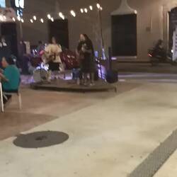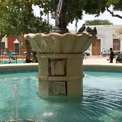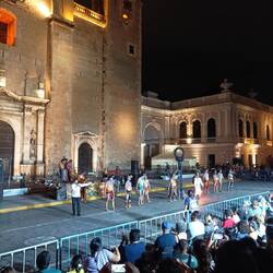 Ein Bruder der zufällig auch Taxifahrer ist holt uns zur Versammlung ab. Es ist wieder total schön und herzlich. Jeder will mit uns reden und unsere Spanischkünste werden wieder aufs äußerste gefordert. Wir lassen uns wieder beraten wo man gut essen gehen kann. Auch wird uns erzählt, dass man in ganz Merida auch guten Gewissens nachts auf die Straße gehen kann. Es ist hier sehr sicher. Gesagt - getan. Wir haben eh noch Hunger und machen daher einen Nachtspaziergang. Im Central-Park von Merida ist wie erwartet Halli-Galli. Es spielt ein sehr edles und anmutiges Konzert mit traditioneller Musik und Tänzen. Wir fragen uns, ob wir hier mit den Kindern richtig sind. Nach wenigen Minuten merken wir, dass hier Eltern mit ihren Säuglingen um halb 10 auch noch am Party machen sind. Also was soll's. Die Leute lachen, ein paar tanzen und zwischendrin machen sich immer wieder ein paar fliegende Verkäufer und Bettler bemerkbar.