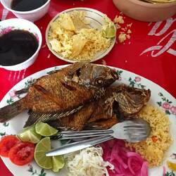 Hier gibt es fast nur Fischgerichte. Aber dafür in allen Variationen. Schön. Die meistens Grills sind allerdings aus und die Inhaber liegen in ihren Hängematten und schlafen. Es ist kurz vor 4 Uhr am Nachmittag. Siesta ist offensichtlich noch nicht vorbei.