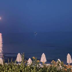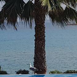 Wir sind auf der Sonnenterrasse unseres Hotels gelegen. Ich habe einen kurzen Abstecher zum Strand genommen und bin ins Meer zumLes mer
