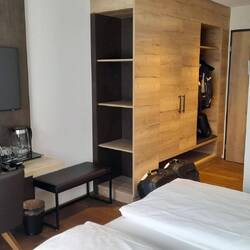 Wir sind hier nach einer wunderschönen Fahrt um kurz vor 14.00 Uhr hier angekommen. Abfahrt war um 8.45 Uhr bei angenehmen 23 Grad. Ankunft bei 32,5 Grad. Wir haben ein tolles Zimmer, der ersteLes mer