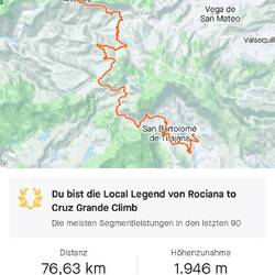 Mir dem Rennrad fahre ich heute hoch hinauf. Zunächst folge ich der Landstrasse CG 654, passiere den Ortskern von Taidia und weiter nach Risco Blanco. Steile Passagen sind dabei und Serpentinen, gigantische Ausblicke, ich gelange bis direkt unterhalb der Felswand des Penón de la Cintura. Wo ich auf die Landstrasse CG 60 treffe ist es noch zu früh zum Umkehren, ich fahre einfach weiter nach Ayacata. Dort angekommen wäre ein schönes Fotomotiv der Roque Nublo, aber für die HandyKamera viel zu weit weg, also muss ich wohl noch 3 km den Berg rauf ... und hat sich sehr gelohnt.