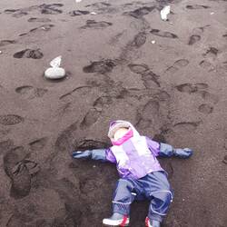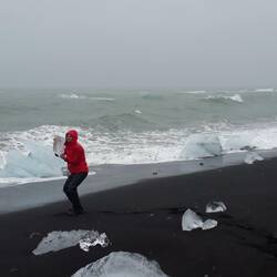Dort, wo der Fluss ins Meer mündet und die Eisschollen in selbiges spuckt, versucht das Meer dieses Eis am Strand wieder loszuwerden. Die faszinierendsten Eisformationen funkeln daher am schwarzen Lavastrand entlang, wo sie die tosende Brandung an Land gespült hat. Dieser Strand wird - passender Weise - Diamond Beach genannt. Die glitzernden Eisskulpturen vor der rauhen See im strömenden Regen, ein paar Robben, die gegen die Wellen ankämpften - eine wunderschöne Szenerie. Während wir begeistert den Anblick genossen, versuchte Theresa begeistert, sich mit schwarzem Sand zu panieren, was zur Folge hatte, dass wir unseren Auslass des Wassertanks kurzfristig als Dusche verwendeten, um das Kind in Regenkleidung wieder halbwegs sandfrei zu bekommen.