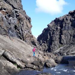 Weiter ging es (zu unsere Überraschung doch wieder auf Schotter) nach Borgarfjördur. Das heutige Tagesziel hat zwei Highlights zu bieten. Einen Felsen voller Elfen, die Alfaborg - Elfenburg der Königin - und einen voller Papageientauchern. Ersteres ist kein Scherz, glauben doch ein Großteil der Isländer fest an Elfen, Trolle und Zwerge - vor Julias und meinen Augen hielten sie sich jedenfalls verborgen. Theresa hatte ihr Vergnügen... sie sieht wohl die Wesen der versteckten Welt.