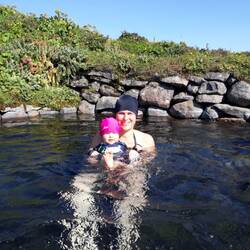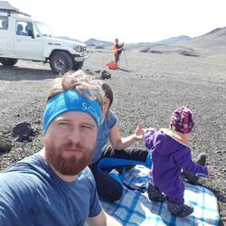 Nach einer - dank lärmender Motorradtouristen am Campingplatz neben uns, die von Roman um 2 Uhr früh ins Bett geschickt worden waren - kurzen Nacht am Fuße der Askja, haben wir uns bei einer netten Rangerin noch aktuelle Infos zu Streckenzustand und Wasserständen geholt, und sind anschließend aufgebrochen, um die Askja, oder besser gesagt ihre beiden Kraterseen, zu Fuß zu erkunden. Theresa schlief schon nach wenigen Metern in der Trage, und wir spazierten durch die Lavawüste. Zu Beginn führte der Weg durch rot-schwarzen Sand und Schneefelder, ging schließlich über in scharfkantige Lavafelder mit Bimsstein-Topping - Ja, tatsächlich ist dort alles voller Bimssteine in allen Größen. Es sieht sehr seltsam aus, wenn im Bach neben einem auf einmal Steine obenauf schwimmen! Schließlich eröffnet sich uns der Blick auf die beiden Kraterseen. Der Hauptsee ist dunkelblau, riesig und eiskalt und sieht einem österreichischen Bergsee nicht unähnlich. Unmittelbar davor in der tiefen Senke eines zweiten, kleinen Kraters mit etwa 300m Durchmesser, liegt der Viti-See. Dessen Wasser milchig türkis schimmert. Viti bedeutet Teufel. Dies versteht man, sobald man sich ihm in Riechweite nähert und den intensiven Schwefelgeruch wahrnimmt. Dieser kleine See wird durch thermale Quellen gespeist, die von der darunter liegenden Magmakammer aufgeheizt werden. Am Boden des Sees ist es daher an einigen Stellen unangenehm heiß. Das restliche Wasser hat durch einen kalten Schmelzwasserzufluss zwischen 25-28°C. Woher wir das so genau wissen? Weil Roman spontan eine Runde im warmen Nass gewagt hat. Den rauchig-schwefeligen Geruch wird er bis am Abend nicht mehr los, wo er auf Grund defekter Duschen ins 4°C kalte Naturbecken am Bach springt - aber das war es wert!