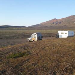 Wir steigern uns schön langsam was unsere Hochlandtouren betrifft, und haben heute nicht nur anspruchsvolle Sand- und Steinpassagen gemeistert, sondern auch zum ersten Mal einige Flüsse gefurtet. Bei rund 30cm Wassertiefe war das zwar eine Anfängerübung, für uns aber dennoch spannend. Der Schnorchel unseres Swamis kommt wohl erst morgen zum Einsatz... da stehen 50cm (plus) am Plan. Heute ist uns in der abgelegenen Gegend östlich der Askja zum ersten Mal ein Ranger begegnet, der in den endlos scheinenden Weiten für Recht und Ordnung sorgen soll. Es wird empfohlen, sich im Hochland mit dem Gegenverkehr über den Streckenzustand auszutauschen. Außerdem soll man bei Kontakt mit Rangern die Gelegenheit nutzen, um Details zu Wasserstand, Wetter und der voraussichtlichen Streckendauer zu erfragen. Der Ranger von heute (Stefan hieß er) hatte eine gute und eine schlechte Nachricht für uns. Die schlechte zuerst. Für heute und morgen wird das Jahreshoch für die Flüssstände im Hochland erwartet. Zum einen, weil es in den letzten Tagen sehr viel Niederschlag gegeben hat, und zum anderen wegen der Schneeschmelze am Gletscher beim jetzigen Schönwetter, was zu einer zusätzlichen Belastung der Flüsse führt. Sogleich seine gute Nachricht: für unseren Swami kein Problem. Wir sind abermals stolz auf unser Auto, welches eine Wasserfurt von 90cm problemlos schaffen sollte. Insgesamt waren wir heute 2x 2h unterwegs. Davon hat Theresa jeweils 1h geschlafen und 1h munter und fröhlich entweder alleine oder mit Mama gespielt... wir finden, unkomplizierter könnte ein Kind nicht sein. Wir wissen es sehr zu schätzen, dass unsere kleine Maus unsere Reise mit so viel Freude mitmacht... nur so wird es zu dem schönen Abenteuer, dass es ist. Unser Weg wurde von Stunde zu Stunde abenteuerlicher und die Umgebung immer unwirklicher. Von Steppe, über Wüste, bis zu wilden Lavafelder, durch die die Piste nur mühsam und wild verwunden das Durchkommen ermöglicht. (Ein Detail am Rande: wir fahren mittlerweile anstelle von 3 mit 2bar Reifendruck. Das bewirkt Wunder... nicht nur auf Sand, sondern auch bei Wellblechpassagen).