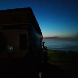 Heute parken wir zwar wieder direkt an der Küste, der Wind peitscht genauso wie gestern, jedoch wird heute mittels Stützen der hintere Teil des Fahrwerks entlastet. Es schaukelt also nicht mehr. Die Konstruktion hat sich Romans Freund und Metallbauer Dipl.-Ing Bernhard Prielinger aus Vorchdorf überlegt. Eine tolle und einfache Lösung. Heute wird zwar wieder mit Wellenrauschen, aber ohne Geschaukel geschlafen.Baca selengkapnya