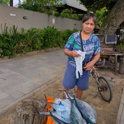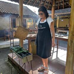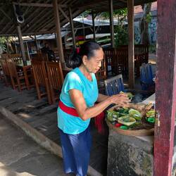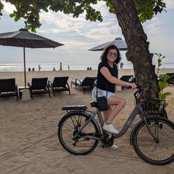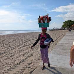 В 6 утра здесь оказалось то что надо, еше не так душно и жарко. Сегодня красивого рассвета не получилось, облачно так что мы сразу встали на тропу и пошли. Оказывается такая мысль была не только у нас, похоже что весь город вообше не ложился. Тут и пешие и велосипедисты и бегуны и плавцы и подрастаюшее поколение танцоров и спортсменов и те самые фотографы - бизнесмены которые фотографируют бегуших.. Короче к 8 утра половина побережья Индийского Океана уже было заполнено местными и море мотоциклов на которых они сюда добрались. Отдыхать они точно умеют. Фотографиями передать весь коллорит абсолютно не возможно, но все таки первое место я отдала женшине в приличном уважаемом возрасте на ржавеньком велосипеде и везущую на своей голове громадный чан полностью заполненный громадными рыбинами, похоже туной. Впечатляет конечно.. Потом опять останавливались в двух кофешках, познакомились с местными из Убуда, сказали что мы сегодня к ним переезжаем т. е. в Убуд. Планируем около 3 на такси уехать в Убуд.Les mer