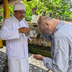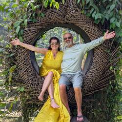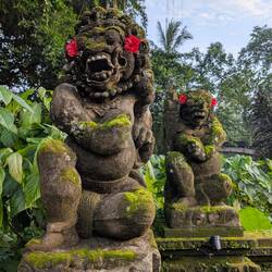 Убуд находится в глубине материка, климат и природа отличаются от прибдежных мест, тепло здесь чувствуется намного легче, пока сауна не чувствуется. После отличного завтрака в резерте нас везут поиграться с обезьянками, в джунглях, где-то час дороги и мы на месте. Наша группа я, Миша и наш гид. Сразу нас предупредили не улыбаться, зубы не показывать и в глаза не заглядывать эти милым мартышкам. Только угощать их орешками, и если найдутся бананы или сладкая картошка они тоже не откажутся. Жизнь обезьян не долгая но похоже счастливая, всего 20 лет, придерживаются строгой иерархии и полному подчинению главного Джона. Похоже он держит все под контролем. В отдельной лесной зоне живут только что родившие и беременные мамочки. Кесарево здесь не делают, 6 месяцев и рожай как миленькая, рождается всегда только одна обезьянка, потом мамочка её кормит грудью почти 4 месяца. Да в джунглях нам показали 300 летние махагами деревья и древнейший храм 7 века. Короче наигрались, насмотрелись и поехали в святой водице окунуться. Там же все и случилось, ну очень сокровенное место. Смотри видио. Еше было интересно кормить сумасшедшее количество рыб,наблюдать из машины за бурляшим ритмом жизни здесь. И несмотря на всё чувство спокойствия и какого-то неземного умиротворения , может из за благовоний в воздухе, храмов больших и малых в каждом доме, бизнесе и просто на каждом шагу, из за очень добродушных балийцев. Страна конечно же очень бедная, но еше раз убеждаюсь что не материальный достаток делает нашу жизнь счастливой ❤️Les mer