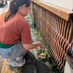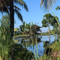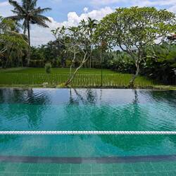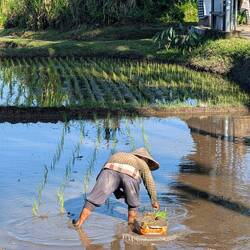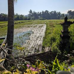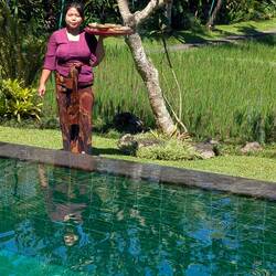 Вернувшись в наш резерт нас еше и покормили вкусненько. А потом уже из нашего бассейна продолжали любоваться рисовым полем. Женшина обходит всю территорию резерта оставляя подношение и благоухания у сакральных мест.