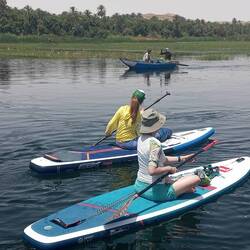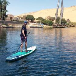 Even without alcohol, the Egyptian team is the winner of yesterday's party night around the campfire - the drums didn't stop until 2 a.m. and the "Nildisko" naturally ended with tea and a small snack before the last two days of Ramadan begin. We were practically up when the others went to bed, because everyone was already paddling motivated at sunrise. The water was smooth as glass and perfect for paddling, so after a quick breakfast snack at 7 a.m. we set off on the last 11 km to Kom Ombo. "Perfect" is of course always in the eye of the beholder, because the feluccas can actually only drift according to the motto "go with the flow" and this is exactly what caused Jamaica's boat, including Jimmy and Stefan, to collide with the bridge-building boats. Just as loud as the collision, Jamaica exploded towards the other boatmen. Understand the world, but according to the motto - why did you stand in the way, the louder screaming seems to win here. Fraction SUP was perfectly timed, because all cruise ships left when we arrived at 9 a.m. Temple and coffee time to fill time until the feluccas arrived two hours later. Kom Ombo is impressively well preserved and some hung out with the English tour group to explore details of the numerous murals. On board the feluccas we had brunch and a heat-avoiding digestive nap while we drifted north on the Nile at snail's speed with no wind. At 3 p.m. the heat becomes bearable thanks to a swimming stop and so we paddled another 12 km into the sunset - followed by the drifting feluccas. We stopped in a small village called Al Faya, where all the village elders were sitting together for a men's chat in the village party room, i.e. community center, when we wanted to charge all our battery packs and phones. As world travelers, we were overwhelmed with questions that we didn't expect at all: How much does a cow cost in the Philippines or in Germany? what does a chicken or a kg of beef cost 😂 What moves people here. The global price increases have not gone unnoticed by the Egyptians either. With them, however, the deteriorated exchange rate is added. A year ago the rate was 1:20, now it is 1:35 and thus the meat price in Egypt is the most expensive compared to Germany and the Philippines. After the delicious dinner prepared by head chef Ahmed, Abdullah opened his bazaar on board and sold his mother's Nubian necklaces and bracelets at the on-board flea market. But one of us landed in the non-existent bunk at 9 p.m. and some made it on the sun deck under the stars with Gintonic until midnight. And as always, tomorrow's motto is: The early bird.... , because from 1 p.m. we expect a headwind of 18 knots. Then tomorrow it's: The feluccas happiness, the paddler's suffering 😂😜Read more
