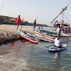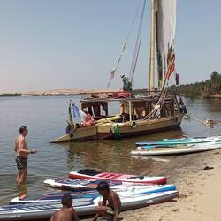 Two decent feluccas then became two chaos galleys, thanks to all our luggage.... The crew had prepared a delicious welcome snack that enchanted all palates.... But so that there was no rest, countless boards with the 3 Pumps filled... Fins mounted and paddles put together, because the first round of paddling on the Nile was coming up... On the water, the hardships of the bus ride were forgotten and there were only ecstatic faces.... We went upstream in the direction of Elephantine Island , where Corinna, Ingrid and Max were already waiting for us... but with one board on the list of casualties... it must have suffered from the heat and burst open at the seam....