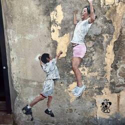 Wikipedia: “In 2012, Zacharevic received worldwide recognition after creating a series of six street art murals for the George Town Festival in Penang, Malaysia, with the BBC calling him Malaysia's answer to Banksy. These images depict scenes of everyday Malaysian life using local people as the models. The two most popular are Children on Bicycle and Boy on Motorcycle; a combination of installation and painting allows the outside community to interact with the works. These murals now stand as cultural landmarks in George Town, complete with plaques and frequent queues of people waiting to have their photographs taken with the works.”