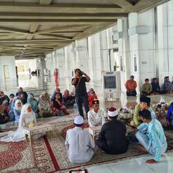 Der ältere Mann (arbeitet für die Moschee) war wirklich sehr süß. Er hat mir während des Erzählens auch immer angeboten, Bilder von mir zu machen (mit meinem Handy) 😊 er war sichtlich stolz auf diese Moschee. Diese war vom Stil her komplett anders, als die, die ich bisher gesehen habe. Es gab sehr viele Stahlelemente und dieses Stahl kommt tatsächlich aus Deutschland 😃. Diese hatte auch nicht wie viele andere Moscheen einen Teppich, sondern einen Marmorboden. Ich empfand sie ein wenig kühl. In dem Prayerroom angekommen waren auf der hinteren rechten Seite ein Teppich ausgelegt und eine Menschenmenge versammelt. Der ältere Mann sagte, dass dort gerade eine Hochzeit stattfindet und ob ich mir das anschauen möchte. Er holte sich das Einverständnis des Vaters des Bräutigams ein und ich habe mich unauffällig (mit dem knall lilanen Gewand 🤣) an den Rand gestellt (während alle anderen auf dem Boden saßen). Ich war mir aber nicht sicher, ob es respektlos gewesen wäre, mich ebenfalls auf den Boden zu setzen. Also habe ich mir das ganze aus sicherer Entfernung angeschaut. Ich durfte auch Bilder und Videos machen.