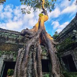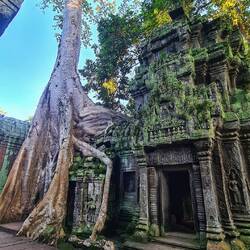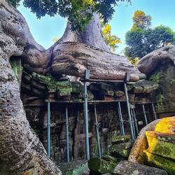 Wikipedia sagt: Eine Besonderheit nimmt der Tempel wegen seines halbverfallenen Zustandes ein. Die Restauratoren und Architekten, die ersten, die in der Neuzeit begannen, die Tempel zu restaurieren, beschlossen, einen Tempel in dem Zustand zu belassen, in dem sie ihn vorfanden. Die Wahl fiel auf Ta Prohm. Die Vegetation und die herabgefallenen Mauersteine wurden nur soweit entfernt und gesichert, dass es Besuchern möglich ist, die Anlage zu begehen. Besonders eindrucksvoll sind die Würgefeigen (Ficus virens) und die noch größeren Tetrameles nudiflora, deren Wurzeln ganze Gebäude überwachsen.