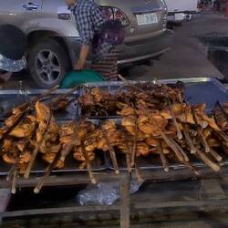 Der Fahrer ließ mich an einer Straße nähe des Hotels mit vielen Streetfoodständen raus, da ich mir dort noch etwas zu Essen holen wollte. Fleisch steht hier ganz hoch im Kurs. Irgendwie wäre mir mehr nach Reis mit Gemüse gewesen, aber das habe ich an keinem Stand gefunden. Also blieb ich an einem BBQ Stand stehen, der frische Spieße auf dem Grill liegen hatte 🥰 das roch sooo gut. Also entschied ich mich für zwei Spieße mit Hähnchenfleisch und fragte, ob sie auch Reis hätten. Unterm Tisch kam ein riesiger Behälter mit Reis zum Vorschein und sie mache mir eine Schale voll. Für alles habe ich 2,5 $ bezahlt und es war sowas von lecker! Leider habe ich nur die Hälfte geschafft. Es war einfach zu viel! Also werde ich den Rest morgen essen 🥰