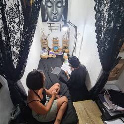 Natürlich hatte ich immer ein wenig die Uhr im Nacken. Britta wollte mich zumindest am Anfang begleiten, falls es sprachliche Barrieren geben würde bzgl des Motives. Also sind wir ca. 10 Minuten vorher los. Das Studio ist direkt um die Ecke auf der belebten Straße. Studio ist gut - das ist ca. 10 qm groß 😅 nach ein paar Startschwierigkeiten bzgl. des Motives war ich irgendwann happy und der Tätowierer setzte die Nadel bzw. den Bambusstock an. Komisches Gefühl! Ja... Natürlich suche ich mir grundsätzlich immer die schmerzhaften Stellen aus - Tattoos müssen sich ja auch "verdient" werden 😄 aber es war tatsächlich ein ganz anderer Schmerz. Irgendwie hatte es etwas Beruhigendes. Ich kann es gar nicht genau sagen. Britta machte zu Beginn ein paar Fotos und Videos und ist dann kurze Zeit später mit den anderen wieder los. Angeblich sollte das Motiv 2 Std dauern also wollte sie später noch mal wieder kommen. Nach knapp 1 Std war ich allerdings schon fertig. Hatte gar kein Zeitgefühl.. Bin dann raus und hab Britta gesucht. Die war total verwundert, dass ich schon fertig war. Eigentlich wäre sie gleich noch mal vorbei gekommen. Zu spät! 😜