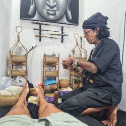 Nils, einer der beiden Jungs hatte gestern erwähnt, dass er auch Lust hätte, sich tradionell tätowieren zu lassen und da ich ihm sagte, dass er scheinbar nur noch heute freie Termine hat, sind wir nachmittags noch mal zusammen hin. Das Motiv welches er sich rausgesucht hat, sollte allerdings mit der Bambootechnik ca. 4 Std dauern. Deshalb war es für ihn raus... Ich habe dem Tätowierer meine ungefähre Vorstellung mitgeteilt und er meinte, dass dieses wohl ca. 2 Std dauern würde. Ich hab einfach zugesagt und ohne das feststehende Motiv einen Termin für 22 Uhr vereinbart und direkt angezahlt. Ich habe zwar schon einige Tattoos aber mich hat diese traditionelle Bambootechnik wirklich sehr beeindruckt. Anstatt mit den zwei versprochenen Crepes, die ich auf dem Rückweg für Britta und mich mitbringen wollte, aber mein Geld einziges Geld als Anzahlung herhalten musste, hatte ich einen Termin in der Tasche. Ich muss auch dazu sagen, dass das Studio (Yoyotattoo art Lombok) hat eine 5,0 Sterne Bewertung, die Menschen stehen Schlange und der hat von morgens bis spät Abend zu tun.. Er hat auch mehrere Zertifikate und Preise von deutschen Tattooconventions an der Wand hängen.