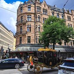 Später im Flieger sitzend und auf den Abflug wartend, meldet sich der Captain, dass eine Sicherung ausgewechselt werden muss und wir daher etwas verspätet abfliegen werden. Der Flug verzögert sich ungefähr um eine halbe Stunde. Während sich Daniela ihrem Buch zuwendet, verschlafe ich einen grossen Teil der Flugzeit. Staunend stellen wir bei der Landung auf dem Airport Arlanda fest, dass wir anscheinend von grossen Wäldern umgeben und offenbar im Nirgendwo gelandent sind. Nasser Boden ist Zeuge von kürzlich niedergegangenem Regen. Der Himmel ist stark bedeckt und die unzähligen, dunkeln Wolken hängen an ihm, wie überdimensionierte reife Trauben. Das Wetter erinnert an das Schweizer-Wetter, der letzten Wochen 🌧 Ein Taxi, praktisch immer auf der Überholspur fahrend bringt uns zügig in die Innenstadt und zu unserem zentral gelegenen Hotel Diplomat. Das Gebäude wirkt wie aus einer längst vergangenen Zeit, ist aber wunderschön renoviert und erstrahlt in herrschaftlichem Glanz.