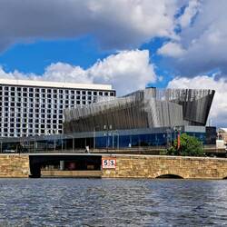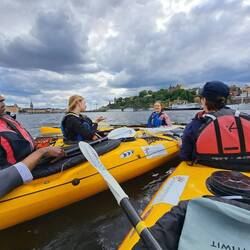 Schnell stehen die Kajaks zum Einsteigen bereit. Unsere kleine Gruppe, aus fünf Personen bestehend, erhält von Anna die letzten Instruktionen, dann dürfen wir los paddeln. Daniela und ich teilen uns ein Kajak und können unsere Harmonie unter Beweis stellen. Daniela stellt sich so geschickt an, dass nichts davon zu merken ist, dass es ihre Jungfernfahrt ist. Meine Steuerkünste lassen zu wünschen übrig. Ob es dabei mehr an mir, oder am Kajak liegt, sei dahingestellt. Daniela ist zeitweise leicht beunruhigt, wenn es nicht gelingt, den Kurs zu halten. Am Ende meistern wir jedoch alle Klippen und gleiten oft im selben Paddelrhythmus über das Wasser. Wir geniessen den Ausblick auf die wunderschöne Stadt, historische und moderne Bauten grüssen aus der Ferne. Nach zwei Stunden gehen wir zwar etwas durchnässt, aber voller Zufriedenheit und um ein herrliches Erlebnis reicher, wieder an Land.