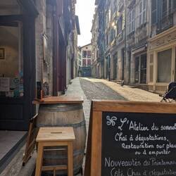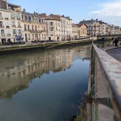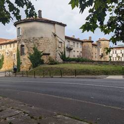 I am sitting on a ruined wall overlooking morning traffic and the River Adour, church bells are marking the hour, a boat swings gently on the current of the river.