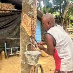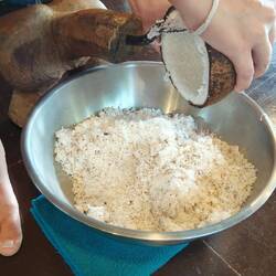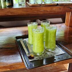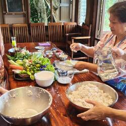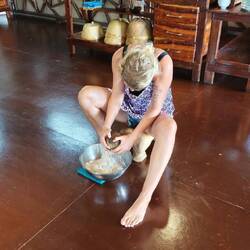 Für unser späteres Dessert wurde als nächstes der Reis ๐พ vorbereitet und frische Kokosnuss ๐ฅฅ gerieben. Ausserdem haben wir alle Zutaten für unser gewünschtes Getränk ๐น zusammengestellt, geschnippelt und gemixt.