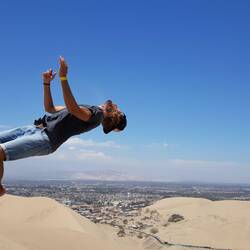 Oben auf der Dünne haben wir wieder mal einen bombastischen Ausblick ... so machen wir Blödsinn-Fotos bis ich mich am Knie verletze. Wir gehen zurück ins Hostel und spielen Wasservollyball mit zwei aus Deutschland. Anschließend gibts lecker Pizza zu Mittag!