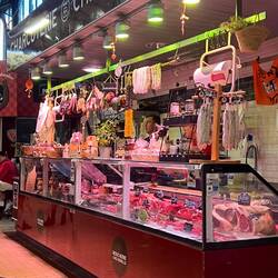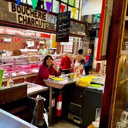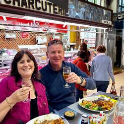 This sort of place would never be allowed in Australia with all our food safety and hygiene laws. The food hall had stalls selling seafood, meats, fruit and veg, mixed in with stalls selling pre-made foods, bakeries and restaurants. Watching the cook at the restaurant next to us shouting his order with a megaphone to the butcher across from him, to the butcher cutting and wrapping the meat to then throw it across the crowd to the cook was very amusing. It was a fun and interesting place to have our last lunch in Narbonne.Læs mere