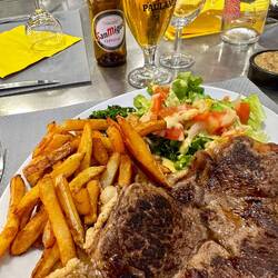 We did however enjoy our lunch in the food market today. It is sometimes a bit confronting trying to work out where to eat when a place is jammed packed with locals and we don’t speak the language. Thankfully Brad did some research last night so we were a bit better prepared and ready to give it a go. We chose to eat at Chez Fourmi. With their butcher counter just across the aisle from their “restaurant”, we knew the food would be fresh. Brad decided to be brave and had a horse meat steak for lunch while I had a grilled chicken breast. Served with their home made mushroom sauce, salad and fries it was a very delicious lunch. Even better was the €2 glasses of white wine and they weren’t stingy with the pour. It was our cheapest “restaurant” meal so far and the food and the vibe was fantastic.