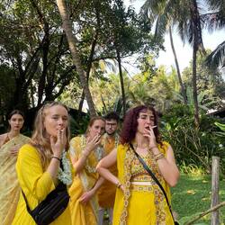 We were so excited for day 2! The first stop was the temple for the religious ceremony. We put on our lovely saris and kurtas and headed to the temple all together in a bus. We had to take off our shoes, cover our hair (the guys wore turbans that they got put on at the resort) and bow at the “altar”. The ceremony was lovely even though we didn’t understand anything. Afterwards there were snacks to grab at the temple but soon we headed back to the resort where a very nice lunch waited. All the food at the wedding was delicious.