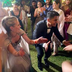 The reception area was beautifully decorated, we mingled and had some drinks while waiting for the couple. Then we were gathered by the father of the groom, to greet the newlyweds with some prskalice. Harsh and Nina Singh entered the venue dressed up, beautiful and ready to party! They opened with a wonderful dance full of love which made most of us shed some tears. After that, it was time for the Slovenian delegation to shine, because the dance of friends followed - we could say that we are proud of our performance, but we would be lying. Our performance was followed by dances from the family of the couple which overshadowed our performance for sure - luckily we were the first!