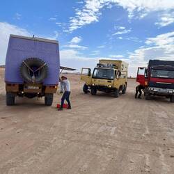 Ein paar Kilometer ging es noch durch Sand und dann Wellblechpiste bis zur Hauptstraße. Dort ein kurzer Halt, um wieder Luft in die Reifen zu füllen und wer schießt da um die Ecke.... die "lila Pistenkuh"!!!! Deren Marokko Reisebuch, mit sehr vielen Pisten und Tipps zum Offroaden, hat Peter als Tourenbuch vorher fleißig studiert. Ein kurzes Hallo und kurzer Austausch und schon ging es für die beiden wieder weiter. Wir zockelten etwas gemütlicher hinterher, auch in Richtung Norden nach Erfoud , um dort auf dem Grand Marche (Markt) einzukaufen. So auch die Lila Pistenkuh: der Plausch wurde fortgesetzt und dann eingekauft.