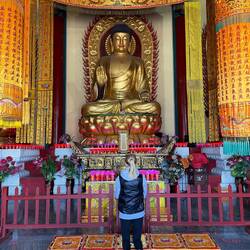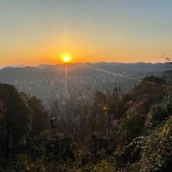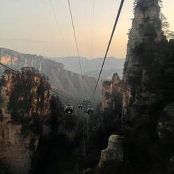 Es ist ein kleines Naturwunder diese „Höhle“, ein 30 Meter hohes Loch mitten durch den Felsen. Ganz oben angekommen und die Aussicht ist bombastisch. Ein grünes Meer an Bergen und Tälern liegt zu meinen Füßen. Hier startet mein zweistündiger Rundweg auf dem Tianmen Mountain. Danach nehme ich noch die längste Seilbahn der Welt in den Bergen und gondle zum Tianmenshan-Tempel. Auf einer Höhe von 1518 Metern gelegen, bietet er atemberaubende Ausblicke und einen majestätischen Gipfel, der den Himmel zu berühren scheint. Nachdem es am Berg viel zu tun gab, bin ich gemeinsam mit einem Guide von meiner Unterkunft losgezogen, damit ich nicht verloren ging. 😇