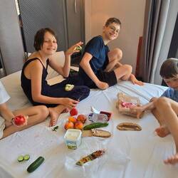 Ian clearly is tired. Grumpy about the tasty food (he wanted yogurth at 2pm rather than delicious mutton 😅) he manages to fall asleep at the restaurant. Then again back at the house while the kids are overly enthusiastic about doing homework. -I was planning on taking it easy too on the first day 😶🌫️-