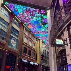 Ein Einkaufszentrum, wo Kunst via LED Wände an der Decke präsentiert wird.