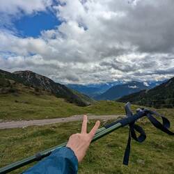 Bestes Wetter und bergige Aussicht. Immer schön Bremsen, es geht ruuuunter. Wir sind noch 2:37 min von unserem ersten Übernachtungspunkt entfernt.