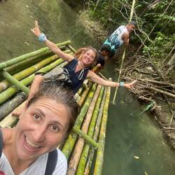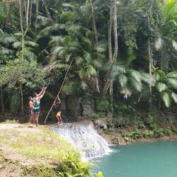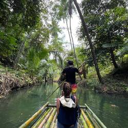 - 2eme arrêt cascade. On est toute seules. Mais obligation de guide, 3 philippins nous accompagnent. Surprise un bateau en bambou nous attends.
