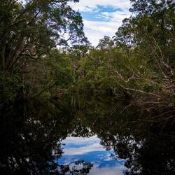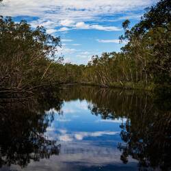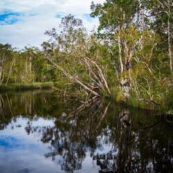 Gestern haben wir dann ausgeschlafen, unsere Sachen gepackt und sind zum nur wenig entfernten Campground im Noosa Habitat gefahren. Und hier kommen wir zum Titel unseres heutigen Beitrags. Dieses liegt in den Everglades. Die gibt es nämlich nur hier und in Florida. Auf unserem Campground leben zudem gut 200 Kangaroos, die sich allerdings etwas abseits aufgehalten haben. Mittags sind wir dann mit einer Bootstour durch die Everglades gestartet. Das war wirklich toll. Das sogenannte Brackwasser entsteht wo Salz auf Süßwasser trifft und ermöglicht beeindruckende Spiegelungen. Tiere waren vor allem zu hören, ein paar auch zu sehen. Als es dann auch noch Bier und Prosecco „aufs Boot“ gab, war die Laune perfekt.