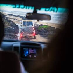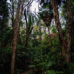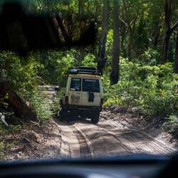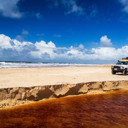Das Highlight folgte aber am nächsten morgen. Wir fanden uns bei Dingo*s Adventures ein und teilten uns mit knapp 30 weiteren Teilnehmern auf 4 alte Toyota Landcruiser auf. Angeführt von unserem Guide Dane, fuhren wir mit wechselnden Fahrern in Richtung K'Gari (aboriginal name für Fraser Island). Auf einer kleinen Landzunge ohne erkennbare Anlegestelle befuhren wir eine kleine Fähre, die uns am wenige hundert Meter entfernten Strand der Insel wieder absetzte. Über den Strand fuhren wir dann durch Wasser, über Stock und Stein, hoch und runter. So hielten wir zuerst an einem ins Meer mündenden Bachlauf und zum mittag in die kleine Ansiedlung Eurong. K'Gari ist die größte Sandinsel der Welt und hat dazu maximal 200 Bewohner, von denen die meisten nur angestellte sind. Die oben genannte Siedlung hat ein paar entsprechende Behausungen, ein Hotel, eine Tankstelle und einen Laden, sowie Handyempfang. Den gibt es sonst auf der Insel aber quasi nicht. Zu essen hatte man Wraps für uns vorbereitet. Nach einer guten Stunde ging es weiter. Durch den tiefsten Regenwald mit beeindruckender Vegetation ging es gut eine Stunde zum Lake McKenzie. Dieser liegt deutlich über Meeresniveau ist aber so klar wie eine Wasserflasche und hat Trinkwasserqualität. Zudem ist der Sand an seinem Strand zu 99% rein. Einfach wunderschön und so erfrischend. Wir waren total begeistert. Die ganze Zeit galt übrigens erhöhte Vorsicht wegen Dingos. Diese leben zu Dutzenden auf der Insel und sind trotz ihrer niedlichen Hundeoptik sehr gefährlich. Nächster Stop war an Central Station, wo einst ein Lebensmittelpunkt der Aboriginal People war. Im anliegenden Fluss gebaren die Frauen zB ihre Kinder.
