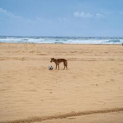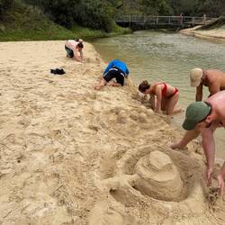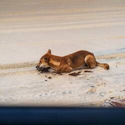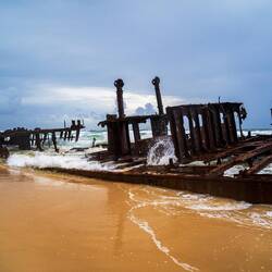 Eines der am häufigsten fotografierten Motive auf der Insel war unser nächstes Ziel. Das Wrack der SS Maheno, die dort vor vielen Jahren auf Grund lief, unter den Wetterbedingungen bot sich eine durchaus bedrohliche Szenerie. Letztes Ziel der Tour war denn der Eli Creek. Ein kleiner Fluss, der aus einer Quelle (halb Regenwasser halb artesisch) mit Trinkwasser gespeist wird. Wir haben dort dann eine ganze Weile verweilt und mit den anderen Teilnehmern unter anderem einen Sandburgenwettbewerb veranstaltet. Zudem ließ sich ein Dingo in direkter Nähe bei uns Blicken und wagte auch einen näheren Blick auf unseren Fußball.