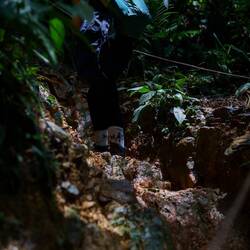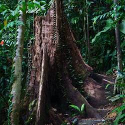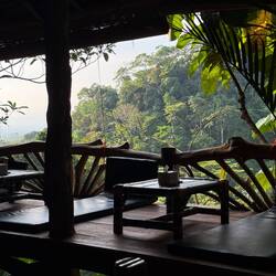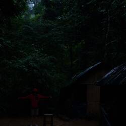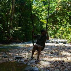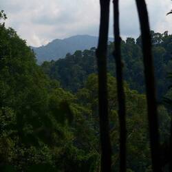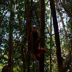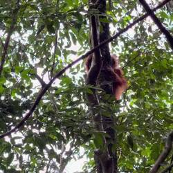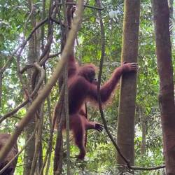 Nach einer Nacht mit Urwaldgeräuschen gab es ein kleines Frühstück und dann ging es schon los. Durch den Fluss, ein bisschen Schaukeln auf einer der vielen Lianen, dann hoch auf einen Berg. Teilweise bis zu 70% Steigung, gut und gerne 150 Höhenmeter, dann wieder runter und wieder hoch, noch wesentlich intensiver als am ersten Tag. Da war das Frühstück schnell verwertet, aber der nächste Snack hat schon gewartet. Und damit war dann eine Orangutandame auf dem Programm, diese habe das mit dem Essen wohl mitbekommen und sei zusammen mit ihrem Baby auf dem Weg zu uns. Also schnell schnell essen, zusammenpacken und in ausreichendem Abstand gucken. Sonderlich schnell sind OrangUtans nicht, aber kräftig und sie beißen. Wir machten im Endeffekt einen großen Bogen um sie und begannen mit dem forderndsten Teil des Weges. Mehrere hundert Höhenmeter mit teils extremer Steigung herunter und zwar auf extrem schlammigen Untergrund. Teils mit Seilen zum Festhalten, teilweise Lianen, teilweise nichts. Im Tal angelangt befanden wir uns am anfangs überquerten Fluss. Noch einmal Lunch und dann mit zusammengebundenen Reifen zurück ins Dorf geraftet, was ein Tag, was für eine Reise.