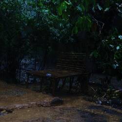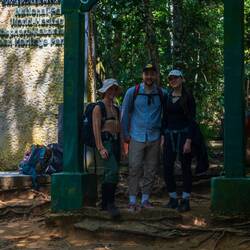 Obwohl wir uns außerhalb der Saison befinden, war wirklich eine ganze Menge an Touristen unterwegs, da wollen wir uns die Stoßzeiten im Sommer gar nicht vorstellen. Wichtig ist zu wissen, dass es zwar Trampelpfade gibt, aber keine wirklich offiziellen Wege. So war der Anfang zwar entspanntes wandern, im Verlauf kletterten wir jedoch zum Teil haarsträubende Wege entlang .Dafür wurden es immer weniger Touristen. Dabei waren meist die durch Wurzeln gebildeten Treppen eine große Hilfe. Teilweise gab es jedoch auch sehr schlammige Wege, die einem alles an Stabilität abverlangt haben. Immer wieder sahen wir verschiedenste Affenarten und noch einige Orang Utans, auch mit Nachwuchs. Nach ein paar Stunden gab es dann den ersten Snack, frische Früchte, die wir selten so aromatisch erlebt haben. Diese lockten dann jedoch auch die kleineren Affenarten an, sodass wir ordentlich auf unsere Sachen aufpassen mussten. In dieser Situation kam es dann auch dazu, dass sich eine Honigbiene in Matthias Hemd verirrte und schlussendlich zustach. Wir denken allerdings, lieber ein Bienenstich als Malaria. Weiter ging es vor allem bergauf und schon eine gute Stunde nach dem Snack gab es dann auch schon Lunch. Wie ihr seht haben die Jungs wieder toll aufgetischt. Aber auch in dieser Situation zog es einen Affen an. Dieser befand sich jedoch über uns und als es irgendwann von oben tropfte waren wir eindeutig vom Urwald getauft. Weiter ging’s. Gegen Nachmittag trafen wir dann am Camp ein. An einem ruhigen Fluss gelegen, befinden sich dort im Verlauf verschiedenste Camps der in Ort ansässigen Trekkingfirmen, je nach Treklänge seien im ganzen Nationalpark camps gelegen. Uns erwartete unser Koch Alberto, der schon fleißig bei der Arbeit war. Für die Gäste standen zwei offene Hütten zur Verfügung mit einfachen Matten, Decken und Moskitonetzen. Zeitnah begann es auch stark zu Gewittern, sodass aus dem gemütlichen Fluss ein reißender Strom wurde. Das Essen war absolut fantastisch, sowas hätten wir im Dschungel nicht erwartet. Nach ein paar Kartenspielen und Gesprächen mit unseren Guides ging es dann ins Bett. Eine besondere Erwähnung verdient übrigens der Locus. Man hat hier ernsthaft einen richtigen Porzellanthron im Urwald eingebaut und mit Wasserschloss versehen.
