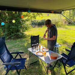 Wir stehen etwas abseits im sogenannten Garten des Campingplatzes. Am CP ist es rappelvoll. Den Garten teilen wir mit EINEM Wohnwagen. So ein Pech 😂🤣
