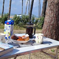Wir landen auf einem FamilienCamping mit Schwimmbad, nicht überfüllt und in Nähe des Meeres. Ein Platz unter den Pinien, es ist traumhaft.