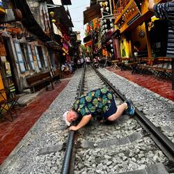 Die meiste Zeit des Tages herrscht hier aber der ganz normale Alltag: Irgendwo döst ein Hund auf einer steinernen Eisenbahnschwelle, weiter hinten hat ein älterer Mann seinen roten Plastikstuhl zwischen die Gleise gestellt und raucht, gemütlich nach hinten wippend, eine Zigarette, neben ihm picken Hühner ein paar Körner aus dem Schienenschotter. Frau Nguyet und die anderen Bewohner der Train Street brauchen nicht auf die Uhr zu schauen, den Fahrplan kennen sie auswendig. Außerdem ertönt vor jeder Zugdurchfahrt ein Klingeln.