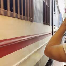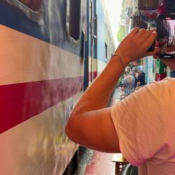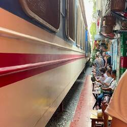 Die nächste Besonderheit ist das grelle Geräusch eines Signalhorns, das kurz darauf durch die enge Straße tönt. Sekunden später rauscht in erstaunlich hohem Tempo ein stählernes Ungetüm heran – ein kompletter Personenzug, der viel zu groß wirkt für die schmale Train Street und alles mitreißt, was nicht festgenagelt ist oder festgehalten wird: die geflochtenen Kegelhüte der Einheimischen, die Basecaps der Touristen.