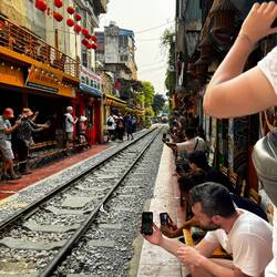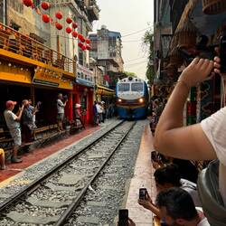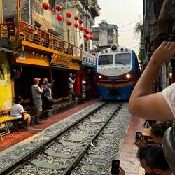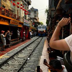 Es ist das leise, aber unüberhörbare Zeichen, dass die Mitarbeiter der Eisenbahngesellschaft gleich die Hauptstraßen sperren werden, die die Bahnstrecke kreuzen. Ein rot-weißer Gitterzaun schiebt sich über den Asphalt. So werden die pulsierenden Adern der Acht-Millionen-Metropole kurzzeitig gekappt, der Verkehrsfluss aus Mopeds, Fahrradrikschas, Autos und Bussen für Minuten gestoppt. In der Train Street bricht in solchen Momenten eine gewisse Hektik aus: Plastikstühle werden eilig weggetragen, Hühner, Katzen und vor allem Touristen von den Gleisen gescheucht. Mittlerweile will sich kaum ein Hanoi-Urlauber den Adrenalinkick entgehen lassen, Bilder zu machen, während ein Zug keine 20 Zentimeter vorbeidonnert.